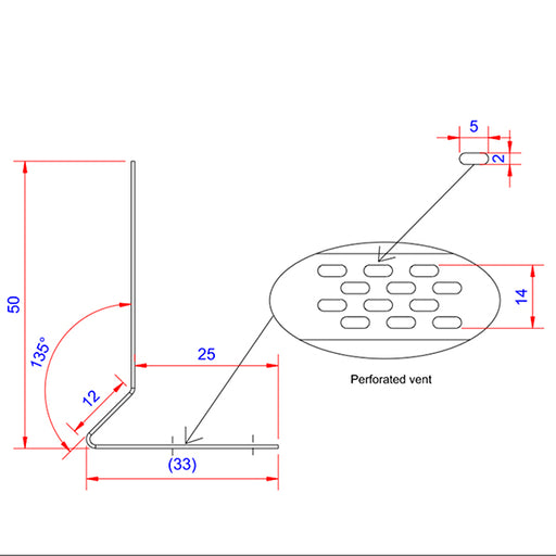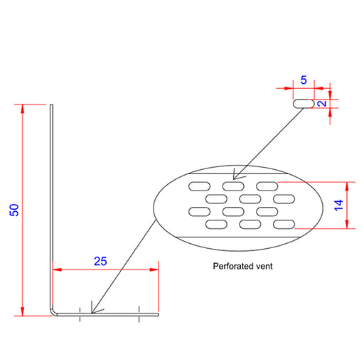 Profileret ventilationsprofil L-type Materiale: Aluminium Farve: Sort Ral 9005 Mål: 25+50 mm Hulstørrelser: 2x5 mm Længde: 3 meter Tykkelse...