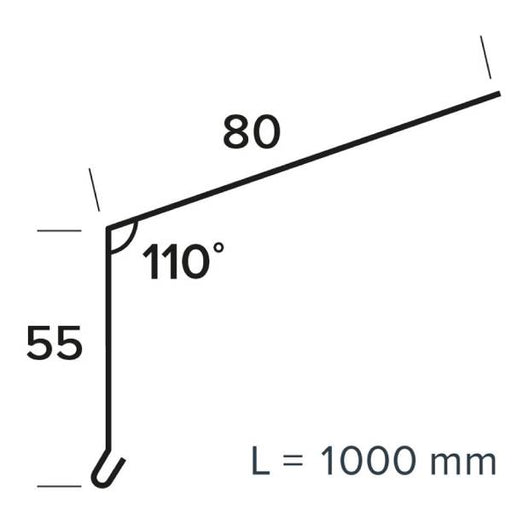 Fodblik nr 12 Materiale: Zink Længde: 1000 mm Dybde: 80 mm Højde: 55 mm Godstykkelse: 0,65 mm Vinkel: 110 grader