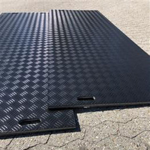 Køreplade Størrelse: 200x115 cm Tykkelse: 0,9x1,2 cm Vægt: 18 kg Materiale: Genbrugsplast Med mønstret overflade samt udstansninger til hå...