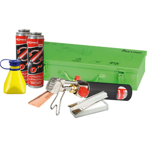 Loddekolbe sæt Loddekolbe: Piezo-tænding Indhold: Metalkuffert med 3 stk. 110 ml gaspatroner (2 stk. "vintergas" og 1 stk. "alm. gas") salmiaks...