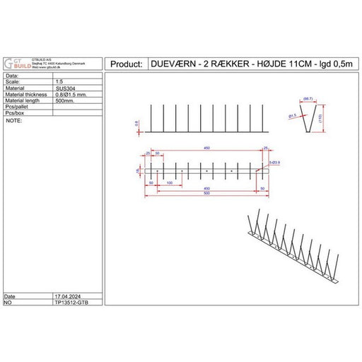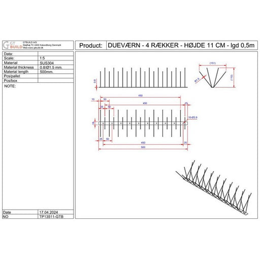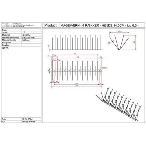 Mågeværn Længde: 500 mm Højde: 11 cm Materiale: Rustfrit stål Farve: Stålfarve Datablad Befæstigelse