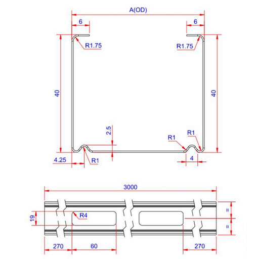 Stållægte til gipsvæg med kabelhul Materiale: Galvaniseret stål DX51D+Z140g Mål: 40x45 mm Længde: 3 meter Tykkelse: 0,5 mm Datablad