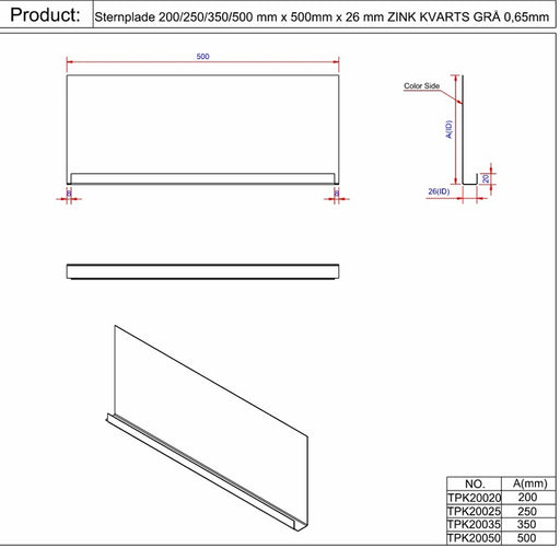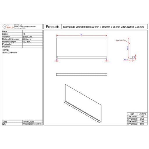 Sternplade Materiale: Zink Farve: Sort RAL 9005 Højde: 350 mm Dybde 26 mm Ombuk: 20 mm Længde: 500 mm Tykkelse: 0,6 mm Datablad Mon...