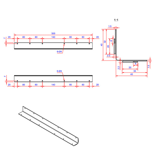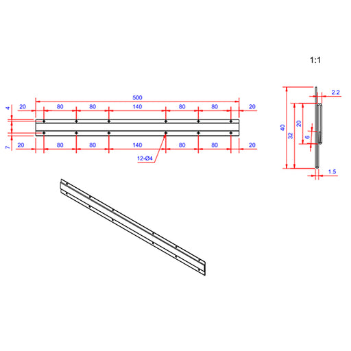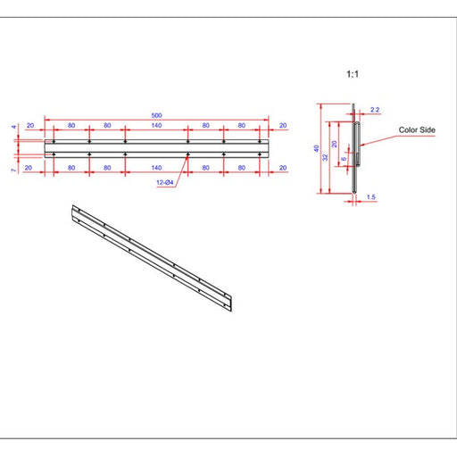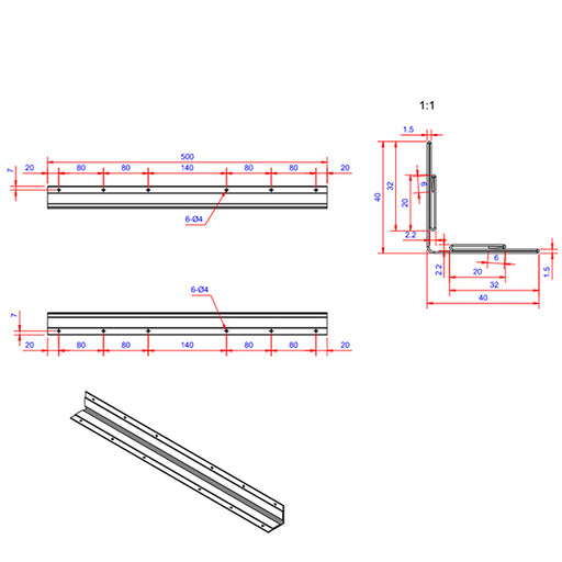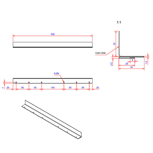 Multifals til sternplade med forborede huller Materiale: Aluminum Mål: 40 mm Ombuk: 6+2,2+20 mm Længde: 500 mm Tykkelse: 0,6 mm Databl...