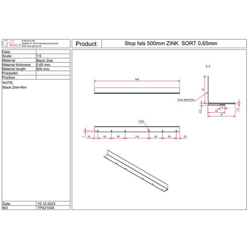 Stopfals til sternplade med forborede huller Materiale: Sort zink Farve: Sort RAL 9005 Mål: 32+32 mm Ombuk: 6+2,2+20 mm Længde: 500 mm Tykk...