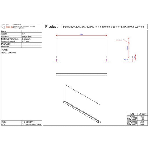 Sternplade Materiale: Zink Farve: Sort RAL 9005 Højde: 200 mm Dybde 26 mm Ombuk: 20 mm Længde: 500 mm Tykkelse: 0,6 mm Datablad Mon...