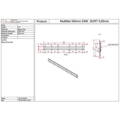 Multifals til sternplade med forborede huller Materiale: Zink Farve: Sort RAL 9005 Mål: 40 mm Ombuk: 6+2,2+20 mm Længde: 500 mm Tykkelse: 0...