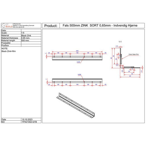 Fals indvendig hjørne til sternplade Materiale: Zink Farve: Sort RAL 9005 Mål: 40+40 mm Ombuk: 6+2,2+20 mm Længde: 500 mm Tykkelse: 0,6 mm...