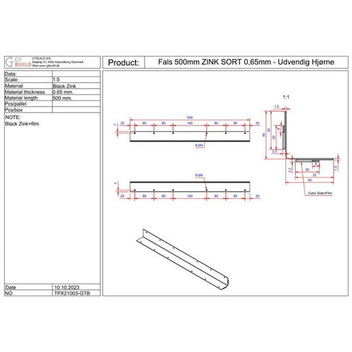 Fals udvendig hjørne til sternplade Materiale: Sort Zink Mål: 40+40 mm Ombuk: 6+2,2+20 mm Længde: 500 mm Tykkelse: 0,6 mm Datablad Montagevejl...