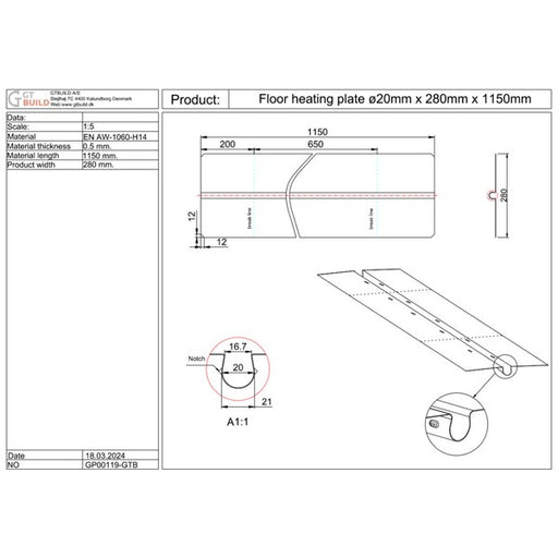 Varmefordelingsplade i aluminium Længde: 1000 mm Bredde: 280 mm Tykkelse: 0,4 mm Passer til: 20 mm rør Forbrug pr m2: 3,57 stk Materiale: A...