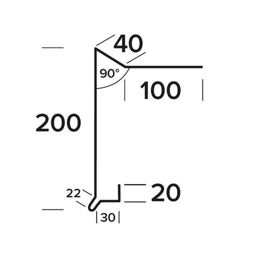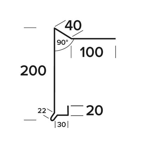 Vindskedeprofil med udluftning Længde: 1000 mm Dimension: 200x40x100 mm Tykkelse: 1 mm Materiale: Blank zink Klippet: Venstre
